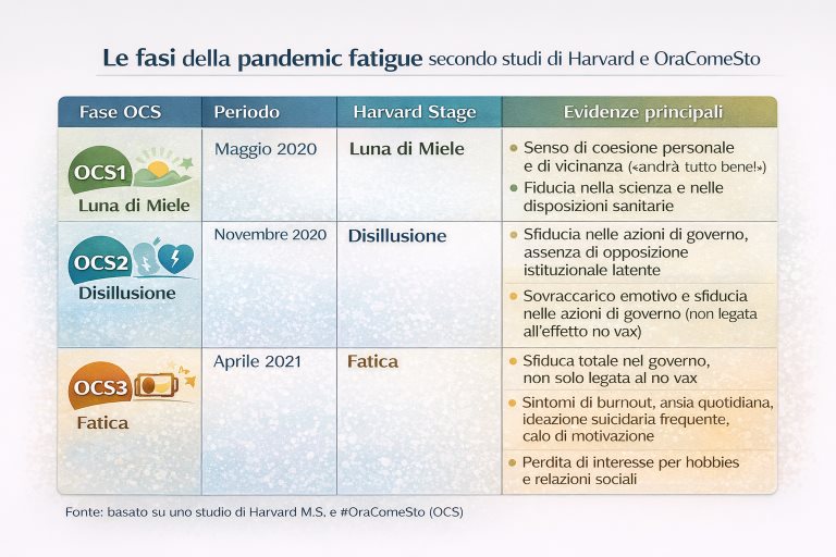 La ricerca ha confermato anche nel contesto italiano il modello della pandemic fatigue per cui dopo una prima fase di solidarietà sociale emerge una fase di stanchezza emotiva. Questo modello è stato sviluppato da ricercatori della Harvard School of Public Health e utilizzato successivamente dall’Organizzazione Mondiale della Sanità (OMS) per descrivere l’evoluzione psicologica delle popolazioni durante la pandemia. Secondo questo modello, le persone attraversano diverse fasi psicologiche ben definite durante una crisi sanitaria.